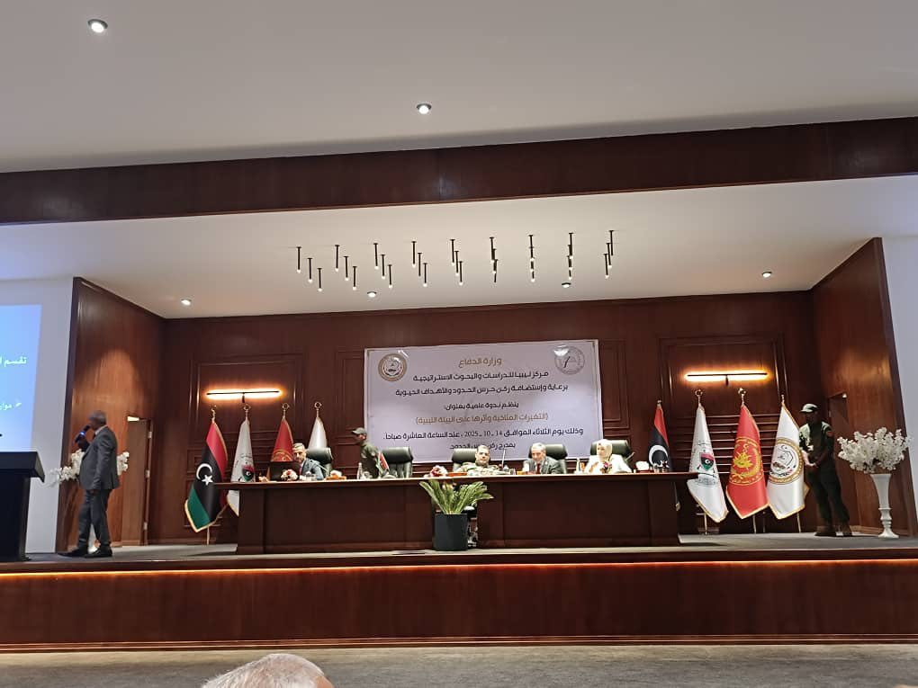 بدعوة كريمة من السيد/ مدير عام مركز ليبيا للدراسات والبحوث الاستراتيجية التابع لوزارة الدفاع (العميد. دكتور. عثمان مخلوف) إلى سعادة السيد/ مدير المركز القومي للبحوث والدراسات العلمية ورئيس اللجنة العلمية (الدكتور. طارق زنبو)، شارك المركز في فاعليات الندوة العلمية الموسومة (التغيرات المناخية وأثرها على البيئة الليبية) الذي نظمه مركز ليبيا للدراسات والبحوث الاستراتيجية صباح اليوم الثلاثاء الموافق 14/10/2025، بقاعة المؤتمرات برئاسة اركان حرس الحدود والأهداف الحيوية، ومثل المركز القومي للبحوث والدراسات العلمية في فعاليات الندوة السيد المحترم/ رئيس قسم البحوث والدراسات العلمية بالمركز (أ. عبدالباسط الدوكالي علي) الذي تناول قضايا وتحديات مواجهة التغيرات المناخية وأثر التغيرات المناخية على الأمن الاقتصادي والبيئي والصحي الليبي، حيث نوقشت في الندوة مختلف القضايا المناخية المؤثرة على البيئة المناخية والاجتماعية والاقتصادية والثقافية في ليبيا، وسبل تحسين جودة نظم الإنتاج والتصنيع الليبي بما يسهم في الحد من التلوث المناخي والبيئي في ليبيا، كما نوقشت قضايا والسلوكيات المسببة في التلوث البيئي وانجع السبل لمكافحتها والتصدي لها، كما أكد الحاضرون على ضرورة دعم الأجهزة الضبطية لتقوم بمهامها على أكمل وجه في الحد من التلوث البيئي الصناعي والزراعي والدوائي. وفي الختام أكد ممثل المركز في الندوة على استعداد المركز القومي للبحوث والدراسات العلمية للتعاون والتنسيق مع مؤسسات الدولة الليبية في مجال تنفيذ مشاريع علمية بحثية مبتكرة وعقد سلسلة ندوات تتناول قضايا البيئة والتلوث البيئي وانعكاساتها على الأمن القومي الليبي في مختلف مجالات الحياة.
